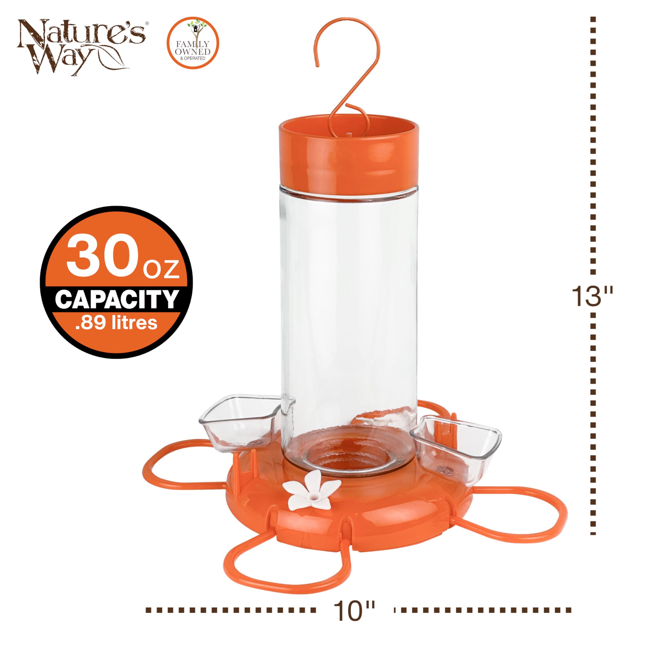 Nature's Way Hanging Glass Oriole Feeder for Outdoor Décor, 30 Ounce Capacity Nectar Feeder, Jelly Dishes, Orange Fruit Holders, 4 Eash to Clean Flexible Ports, Ant Moat, Bee Guards, Orange